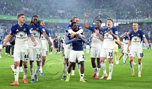 Schlussjubel v.l. Luka Vuskovic, Giorgi Gocholeishvili, Nicolai Remberg, Yussuf Poulsen, Jordan Torunarigha, Miro Muheim (HSV)
