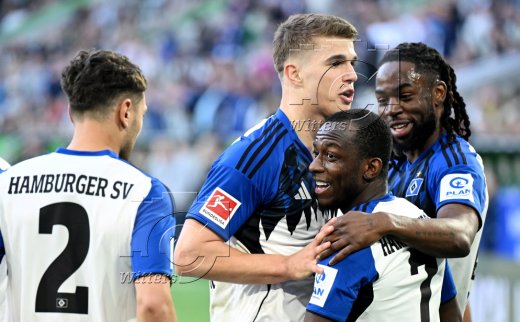 1:2 Tor, Jubel v.l. William Mikelbrencis, Luka Vuskovic, Torschuetze Jean-Luc Dompe, Jordan Torunarigha (HSV)